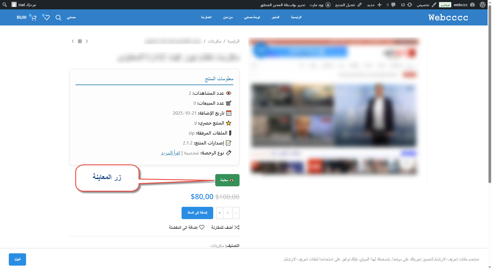 زر معاينة أنيق يظهر تلقائيًا في صفحة المنتج.
