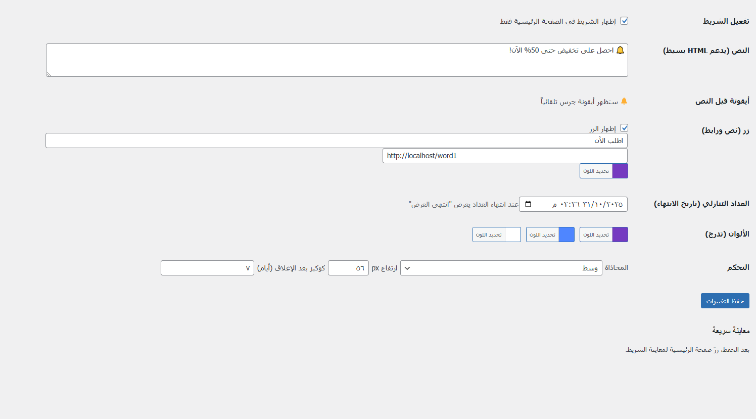 لوحة تحكم سهلة الاستخدام: تحكم كامل في النص، الألوان، الزر، العداد، الكوكيز، والخط من لوحة إدارة ووردبريس.