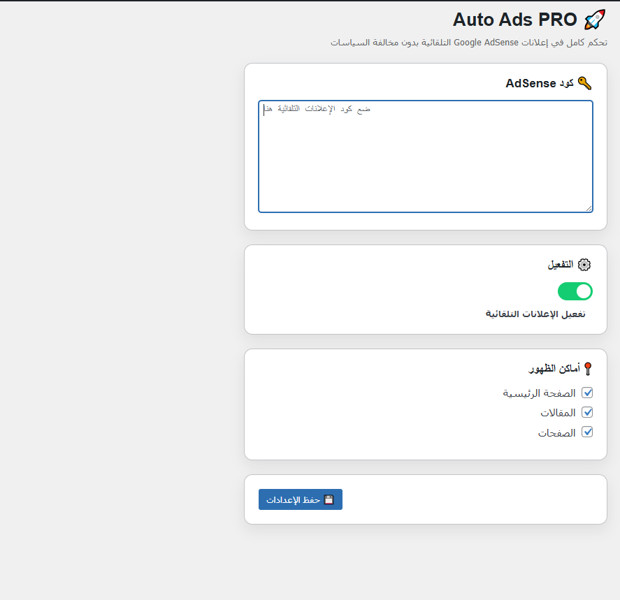 Auto Ads PRO هي إضافة ووردبريس احترافية للتحكم الكامل في إعلانات Google AdSense التلقائية على موقعك، مع ميزات متقدمة لإدارة مواضع الإعلان داخل الموقع والمقالات والصفحات بطريقة ذكية ومرنة.